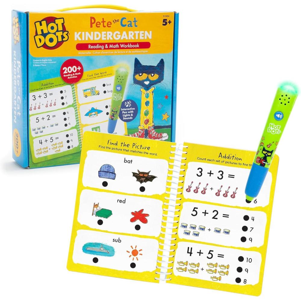 Educational Insights Hot Dots Pete The Cat Kindergarten Reading & Math Workbook – Kindergarten Workbooks with Interactive Pen, Homeschool Learning Books, Build Early Reading & Math Skills, Ages 5